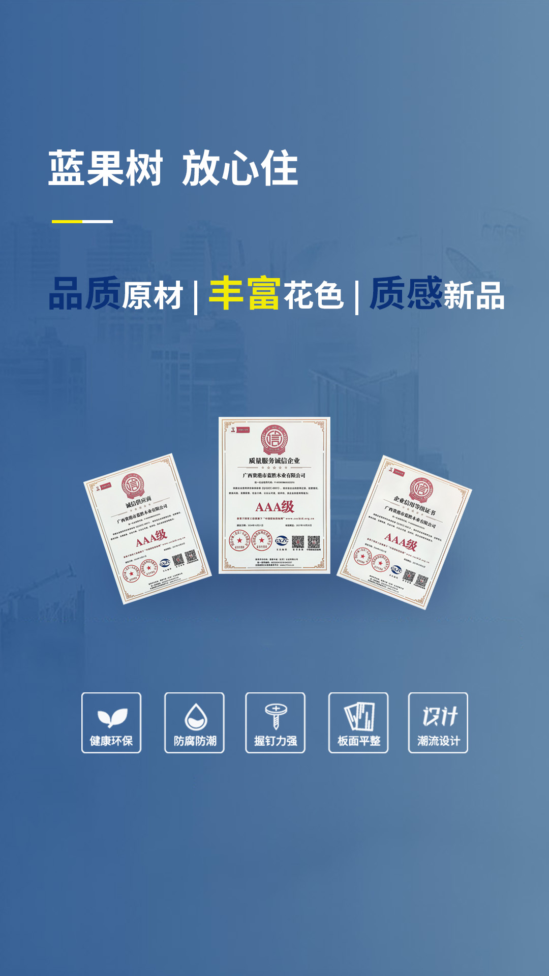 藍果樹板材為廣西藍勝新材料集團有限公司旗下新型環保高新技術品牌,公司以板材研發及生產高品質產品為發展方向,擁有100條生產線,年產50萬立方米生態免漆家具板。